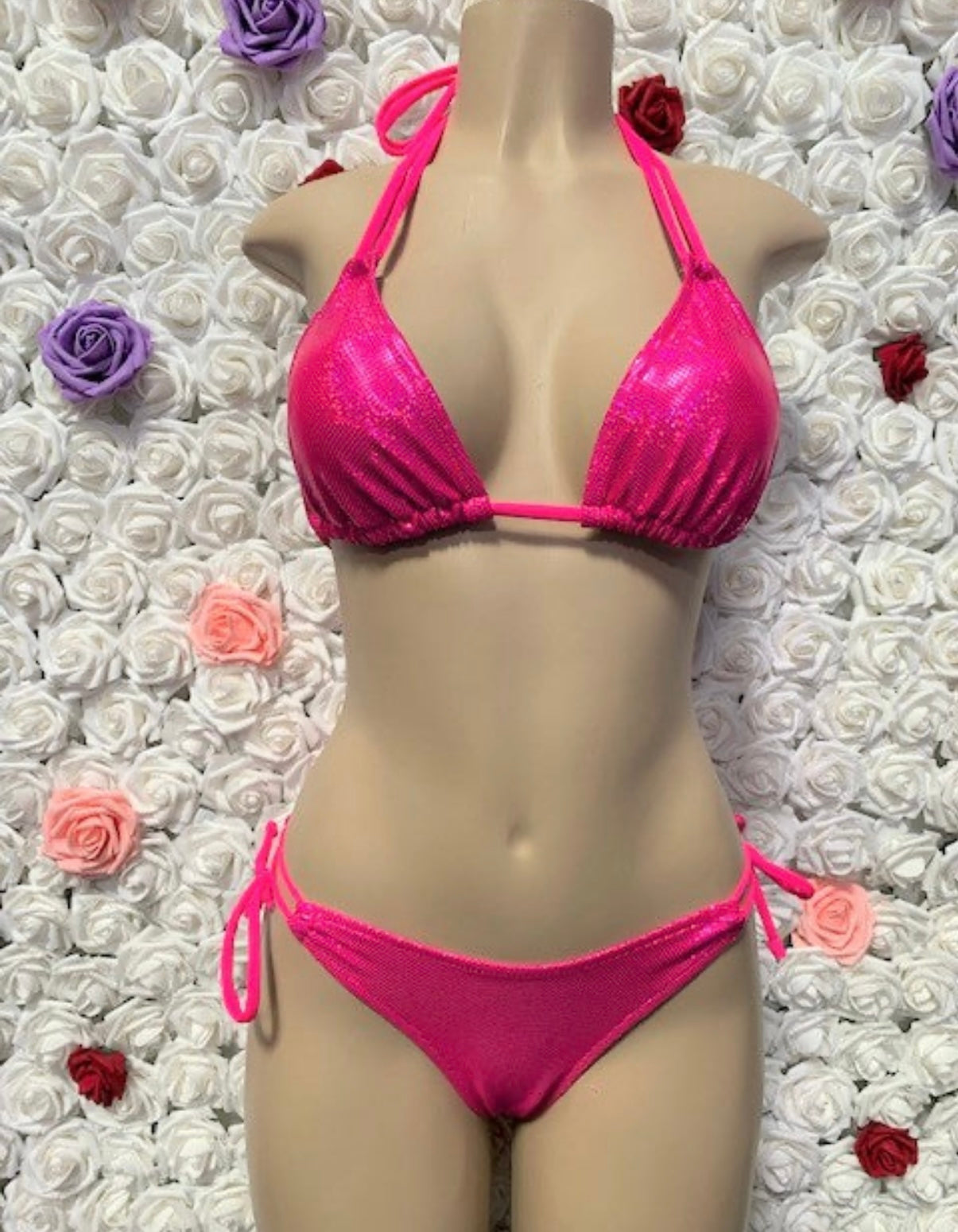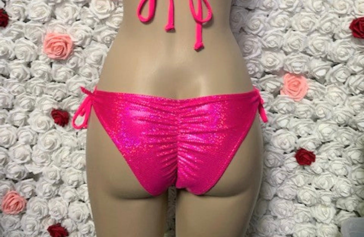 Cabo Tie Side Bottoms in Barbie Pink Metallic with solid Goddess Raspberry ties