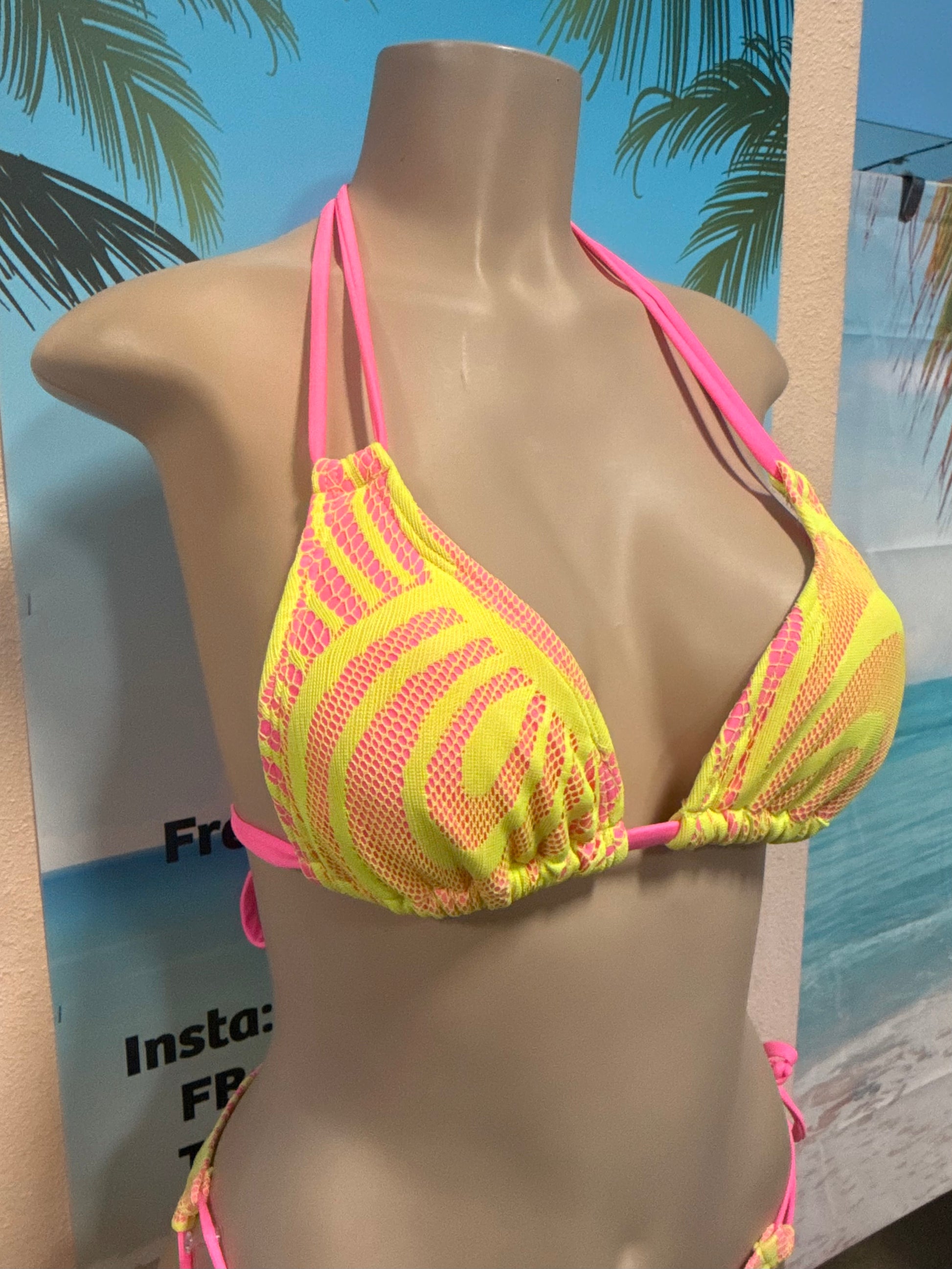Layla Triangle Top and ties in Neon Pink with Neon Yellow crochet/net overlay