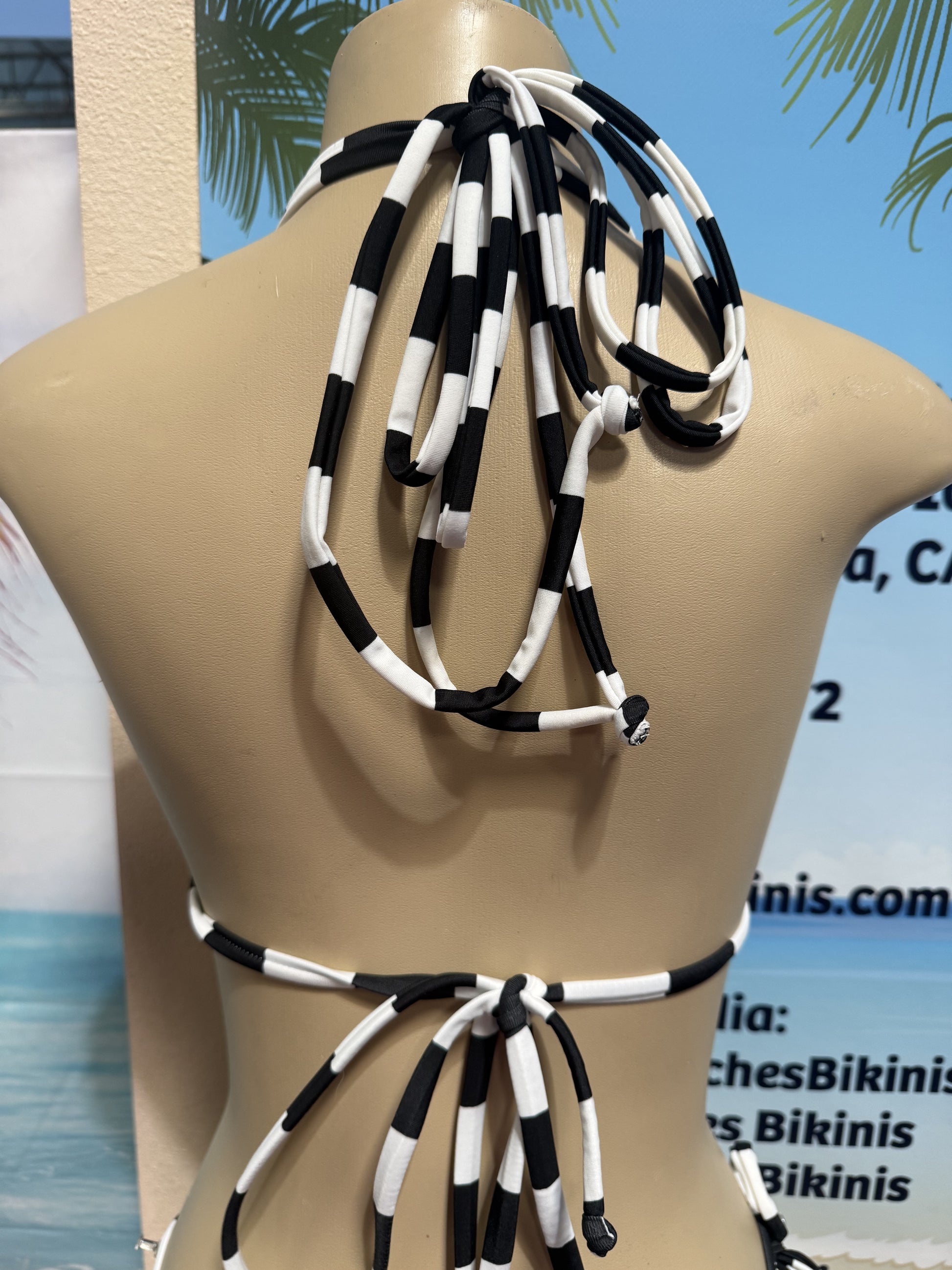 Layla Triangle Top in Turquoise and Black Flowers with Black and White Striped ties