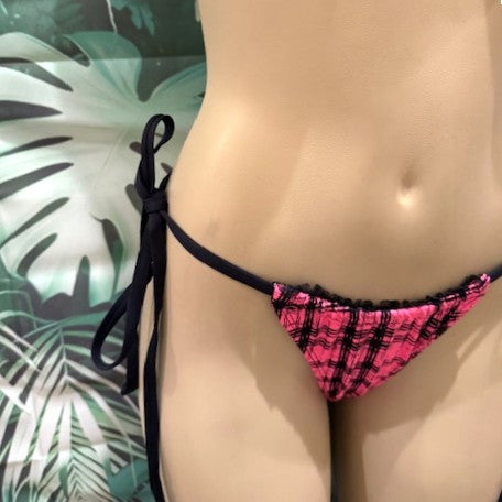 Tahiti Bottoms in Hot Pink As If Plaid with Black Ruffle trim and ties